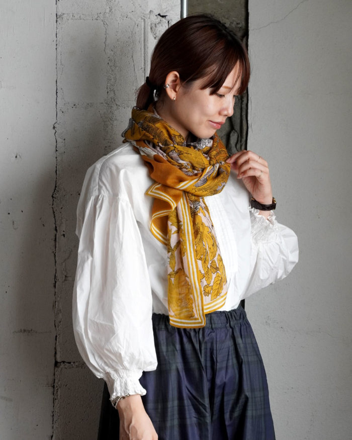 シンプルな服装にさっと巻くだけで装いを華やかに彩ってくれます。