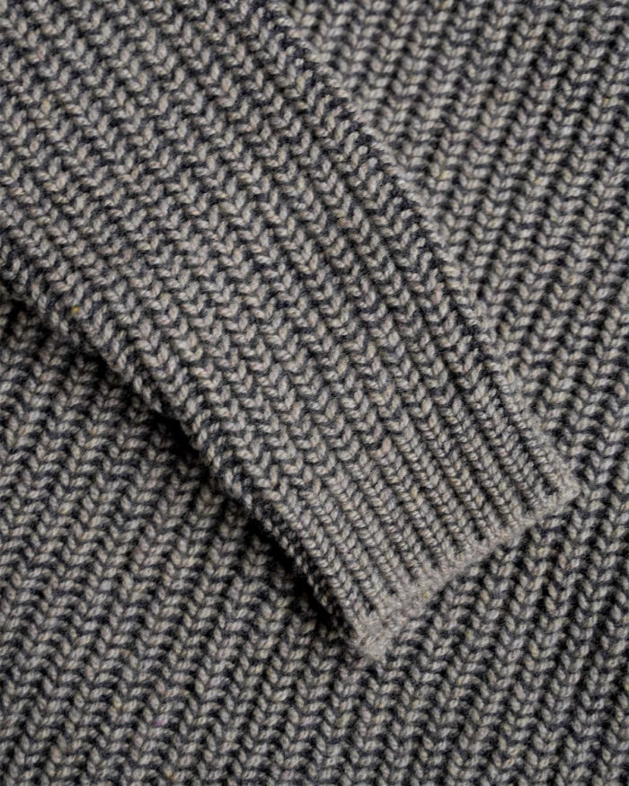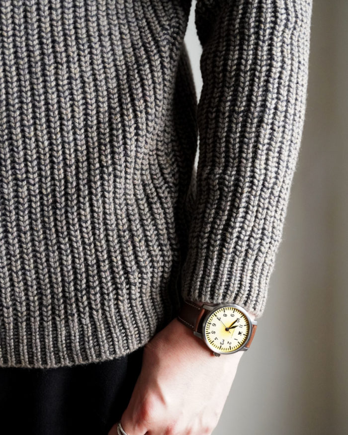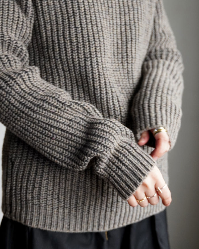 リブ編みとさりげないケーブル模様が生む立体感は、
