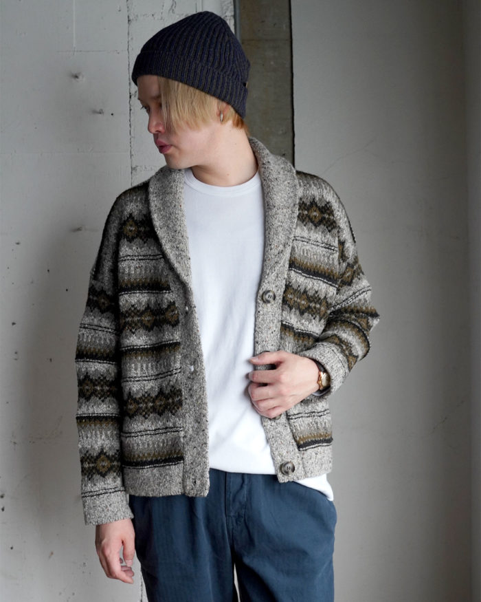 胸元にゆるやかに沿うショールカラーと、伝統柄を散らした編み模様が、