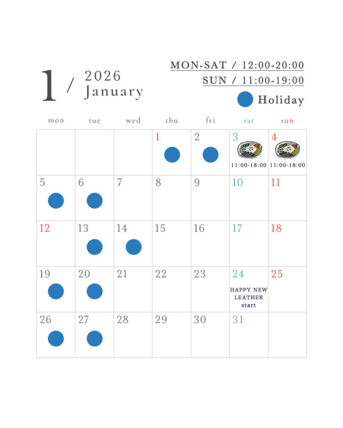 お休み 1/1(thu),2(fri),5(mon),6(tue),13(tue),14(wed),19(mon),20(tue),26(mon),27(tue)