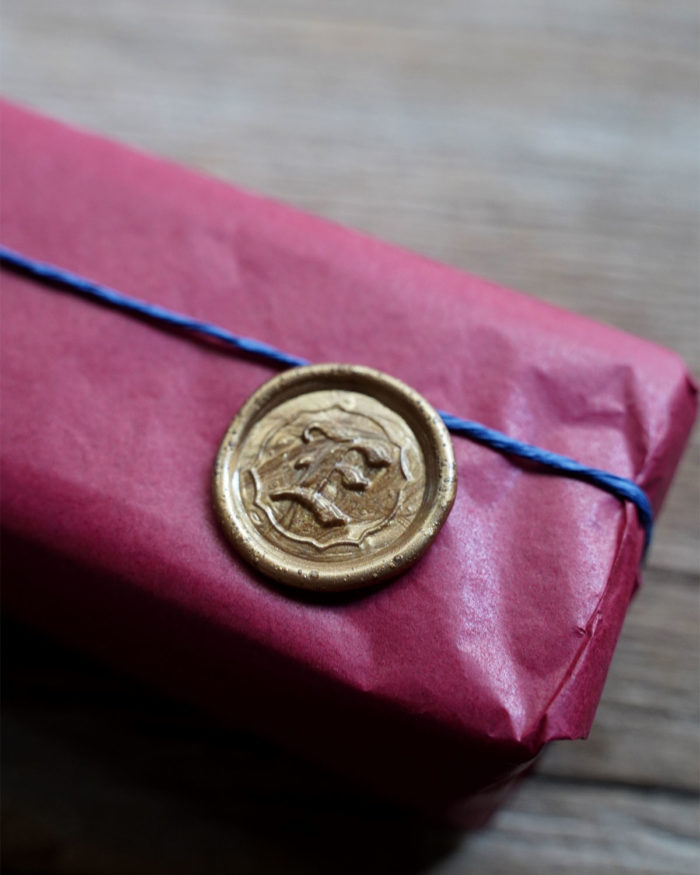 赤色の薄紙で包み、ちょっとした贈り物らしく。
