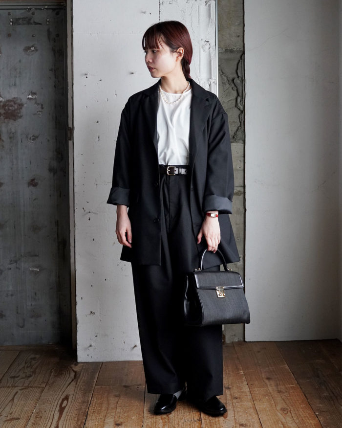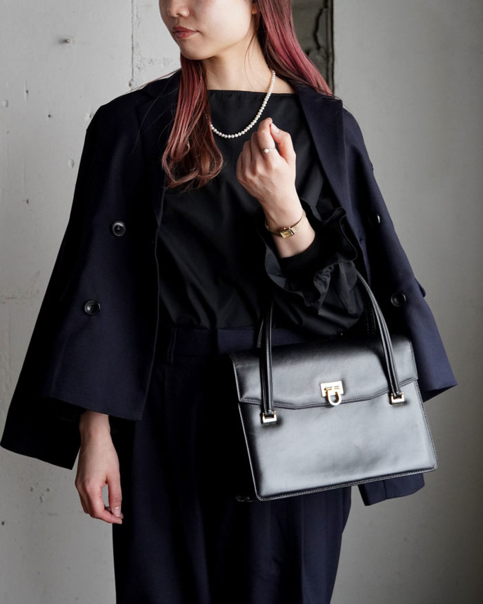 レザーバッグやパール系ジュエリー、ブラックのワンピースやスカート、